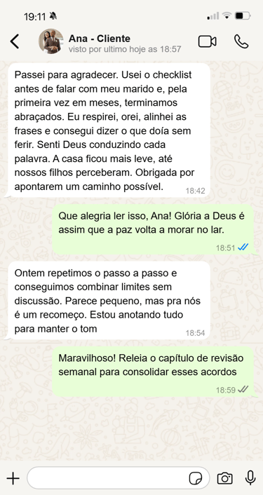 Muitas leitoras relatam alívio nas primeiras conversas ao usar o checklist. Mudança profunda vem do uso consistente (dias e semanas).