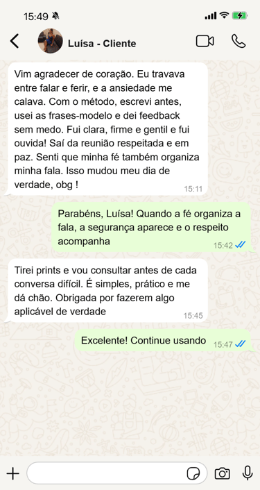 O que vem: roteiro passo a passo, perguntas de sondagem, “dizer sem ferir”, do/don’t, oração pré/pós-conversa, revisão em 2 min.